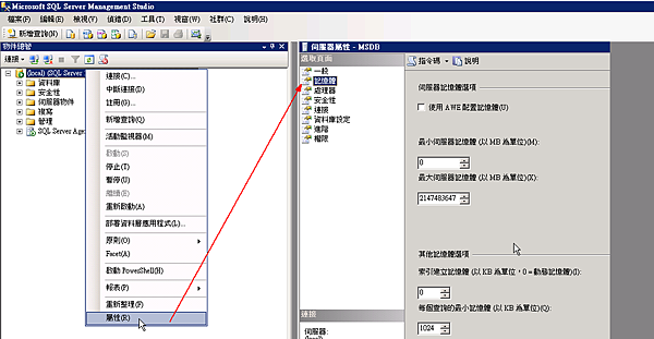 1. 實體記憶容量若總共有8G,則請調整MAX SERVER MEMORY為6 GB,請保留 2GB 給作業系統使用,您可視實際情況再進行調整。請您進行下記憶體的設定確認。