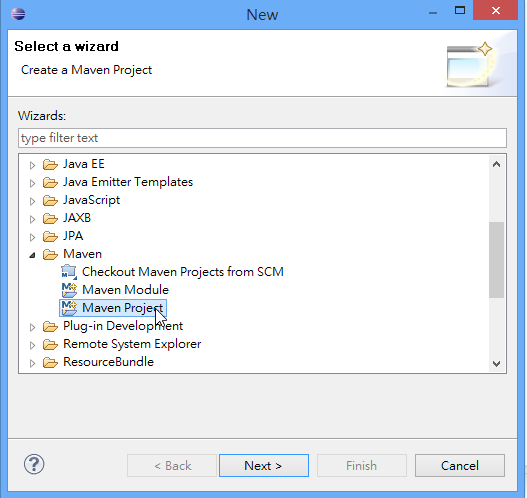 也是可以利用 Eclipse Markplace 中去下載,與 eclipse 整合;若是整合 (Embedded) 在一起的話,那 eclipse 在 New 一個專案時,就可以看到 Maven 的選項