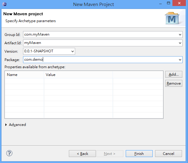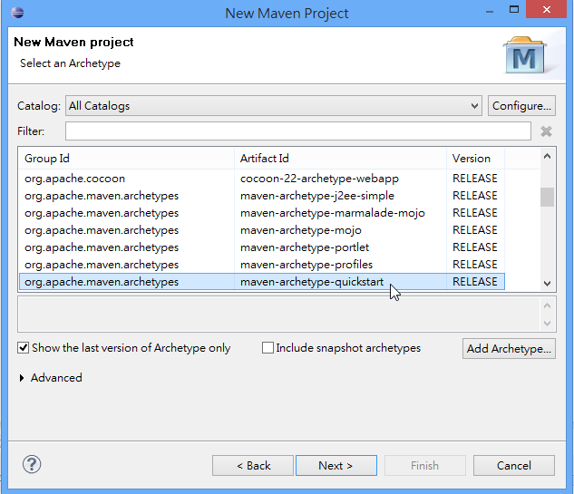 選擇 Maven Project 預設的 Archetype:maven-archetype-quickstart