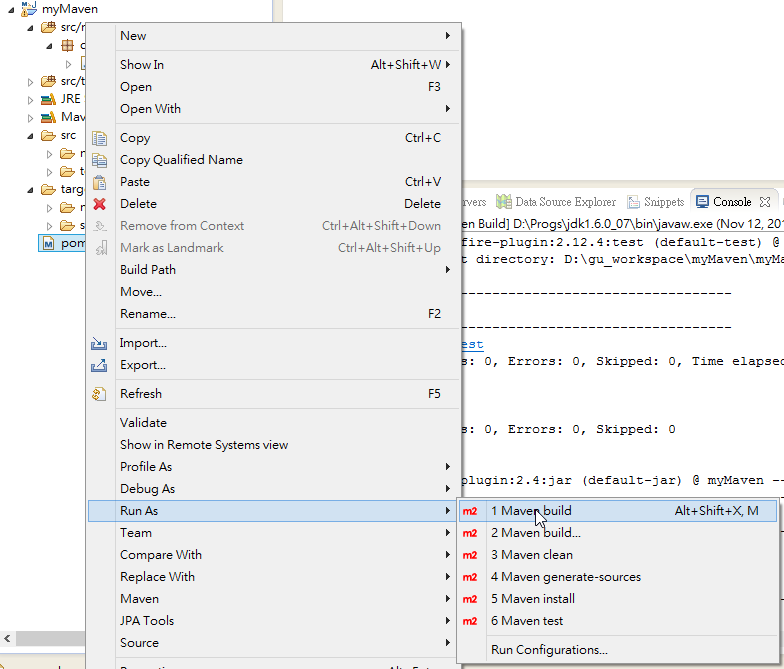 再針對 pom.xml 作 Maven build , 就會在 target 目錄下得到:myMaven-0.0.1-SNAPSHOT.jar