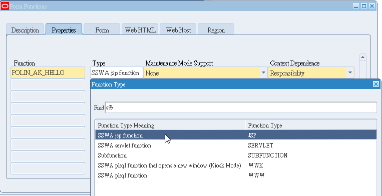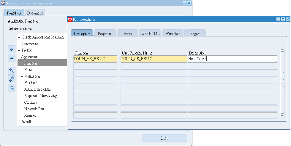 先規劃 Funtions 的相關屬性再作設定,HTML Call 則是 Step02 中,class file 上載到 EBS 主機上的 $JAVA_TOP 相對應的目錄下,此例為/oracle/apps/ak/hello/webui/HelloWorldPG,所以HTML Call:OA.jsp?page=/oracle/apps/ak/hello/webui/HelloWorldPG