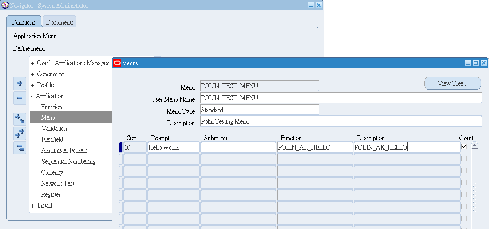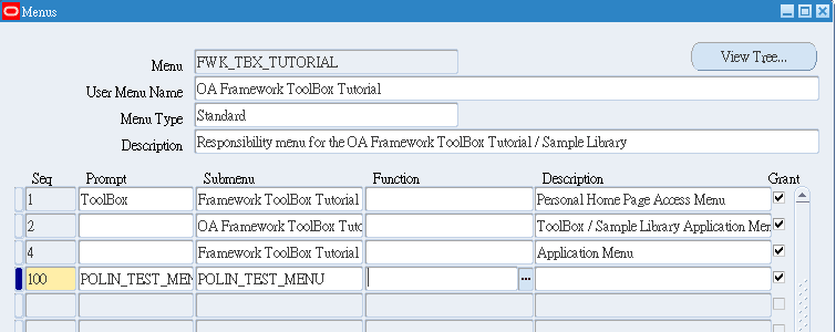 再將剛設定好的 Menu:POLIN_TEST_MENU 掛到 Menu Name:OA Framework ToolBox Tutorial 這個的下面