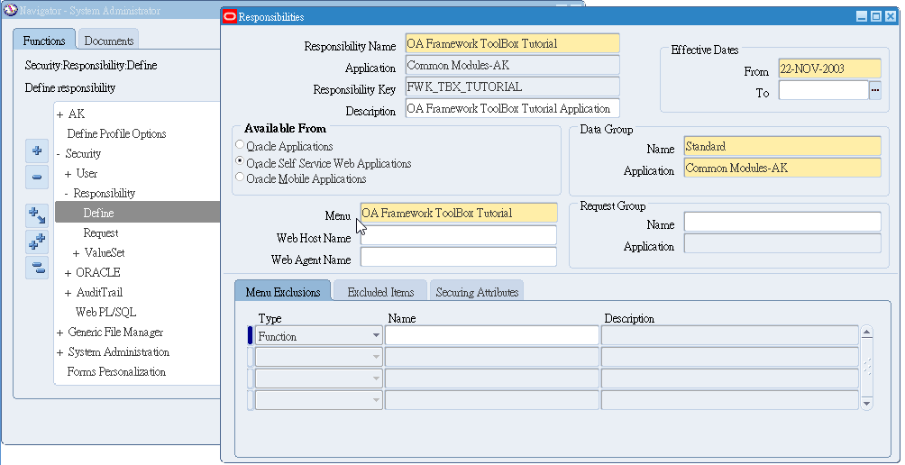 先查出 Responsibility Name:OA Framework ToolBox Tutorial 掛的 Menu Name:OA Framework ToolBox Tutorial