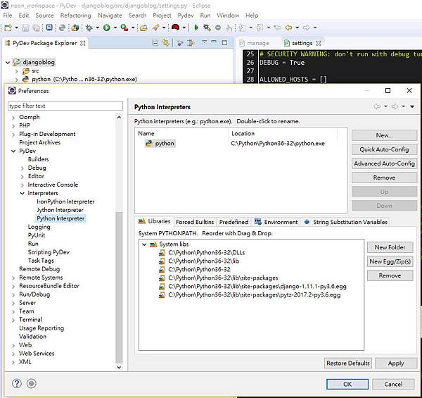 將 Django-1.11.1.tar.gz 解壓縮在 C:\Python\Python36-32 目錄下,然後執行下列指令