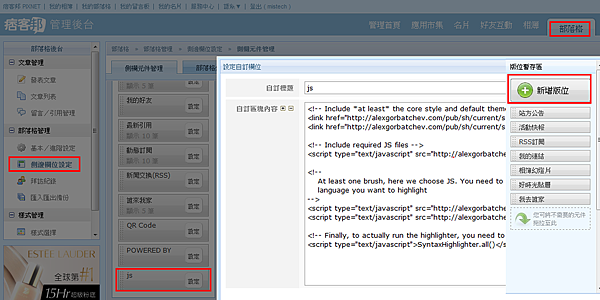 2. 然後在部落格管理的"側邊欄位設定"增加一個名為 JS 的側欄,或是在 「管理後台」-->「部落格管理」-->「側邊欄位設定」-->「頁尾描述」-->「設定」 加入 ,為了網頁美觀建議放在側欄最底部。