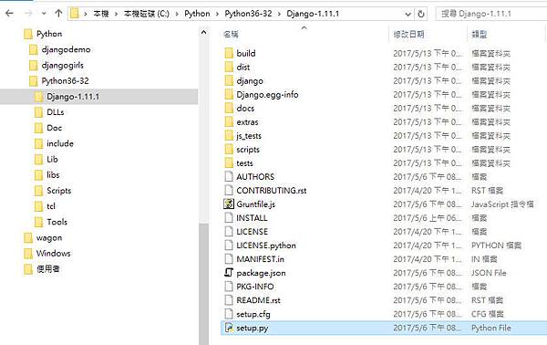 將 Django-1.11.1.tar.gz 解壓縮在 C:\Python\Python36-32 目錄下,然後執行下列指令
